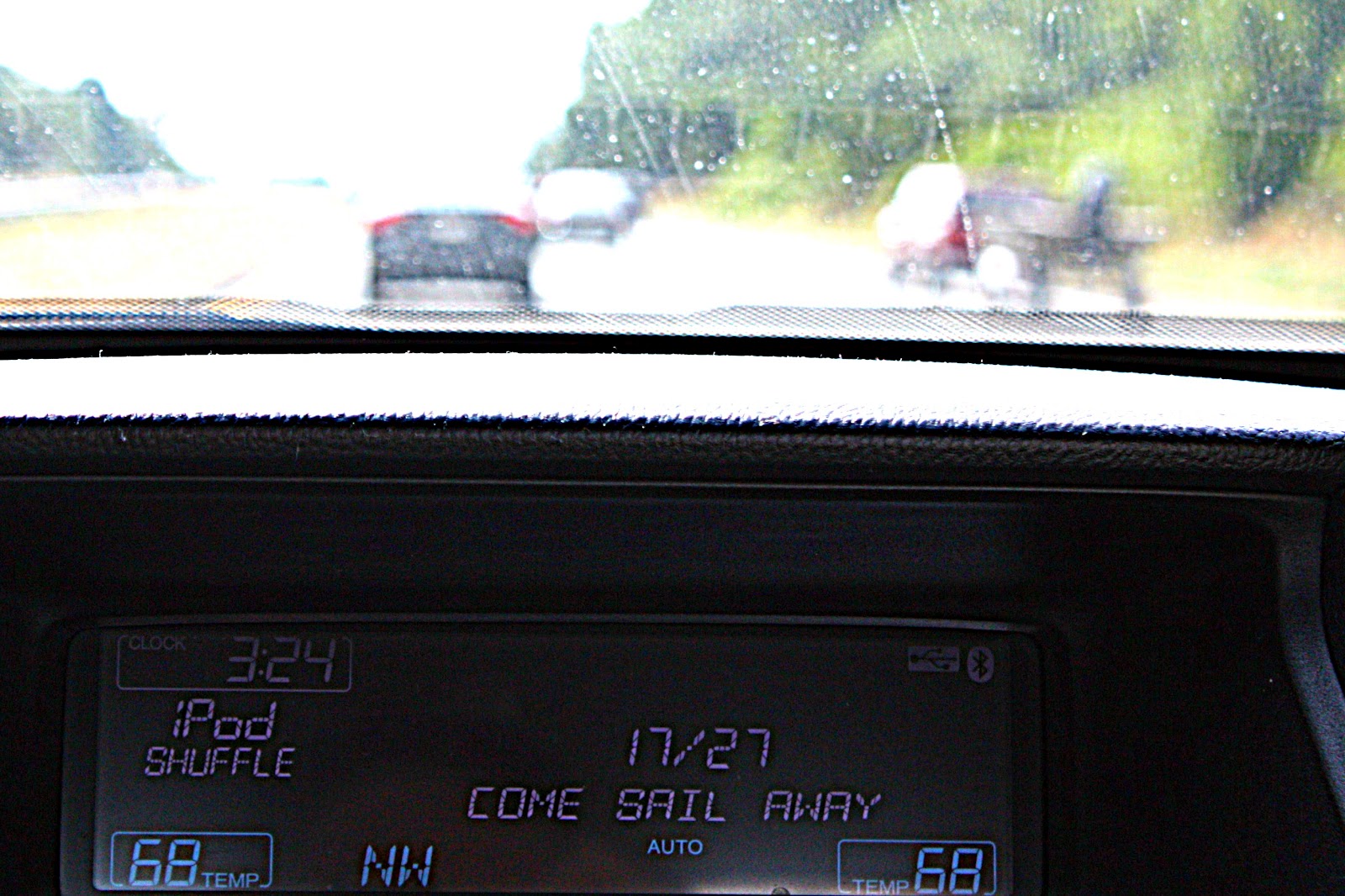 Inside the car? Perfectly calm. Good music, lively conversation and just the right temperature.